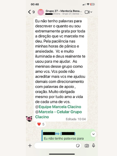 Se você ainda não me conhece eu sou Marcela Clacino - Psicanalista e Neurocientista, especialista em restaurar relacionamento que acabaram. Após viver uma crise no meu casamento e passar por um deserto, foi exatamente ai que descobri meu propósito de salvar histórias de amor. Nessa jornada foram muitos anos de estudo entendendo a mente masculina e comportamentos, através da neurociência e psicanálise, onde criei um método exclusivo e infalível, que já salvou mais de 13 mil histórias que pareciam impossíveis (veja os testemunhos).